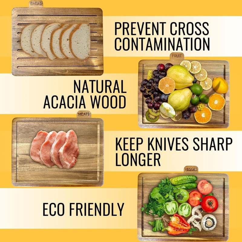 - SAFE CHOPPING - Our best nontoxic wooden cutting boards for kitchen come with smart organizer tabs labeled to separate your meat, bread, vegetable, and fish mats from each other; ensuring that your food stays 100% healthy.