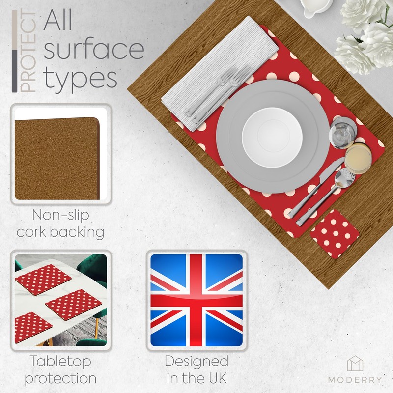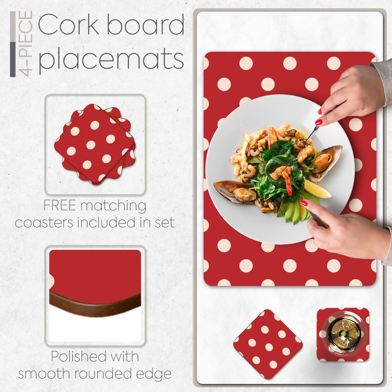 - 1- CORK PLACEMATS SET OF 4: Designed in London, England, these beautifully finished placemats in a high-quality lacquered red polkadot design cork backed placemats come in a most practical size of 15.75" x 11.4" each; Backed with a naturally non slip cork, our 0.2" thick dining table mats offer ultimate protection without compromising on unique table decor qualities