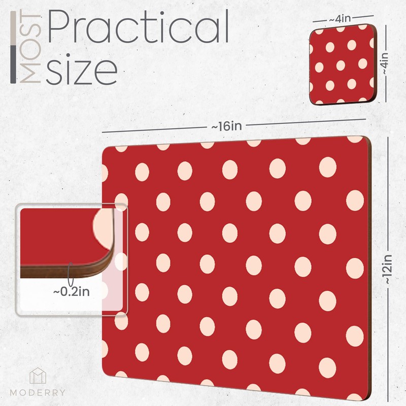 - 3- CLASSIC POLKA-DOT ELEGANCE: These beautifully polished with smooth rounded edges hardboard placemats and coasters feature uniquely minimalistic yet ever-fashionable modern gorgeous "unexpected red" and cream polkadot design; Luxurious addition to any dining set, our plate mats for dining table will guarantee to demand attention, adding an air of originality and finesse