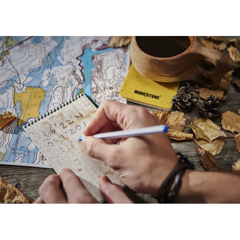 - Modestone stone paper works with an ordinary pen or pencil, however you can also write on it with an old key or even a bullet, allowing you to write even in tight spots without a pen. Stone paper is thoroughly waterproof and will not suck water on the cut edges. Modestone waterproof notepad is well suited for dirty, sweaty or humid conditions. Modestone is also an eco-friendly choice.