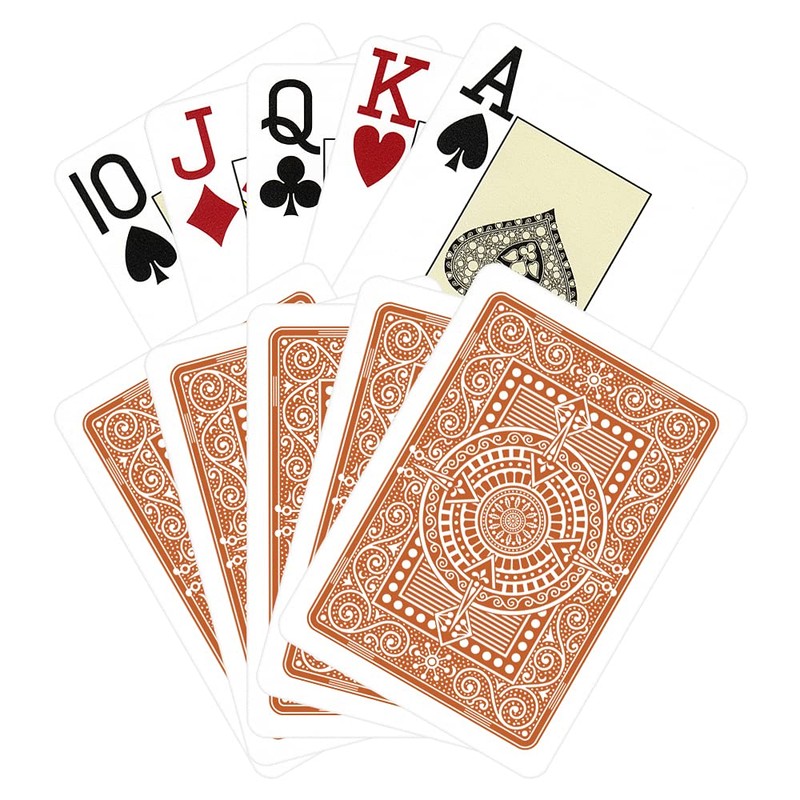 This poker sized playing card set from Modiano is made from 100% plastic and has a brown patterned back, 52 playing cards and 3 jokers. It is cello wrapped and packaged in a protective coloured box.