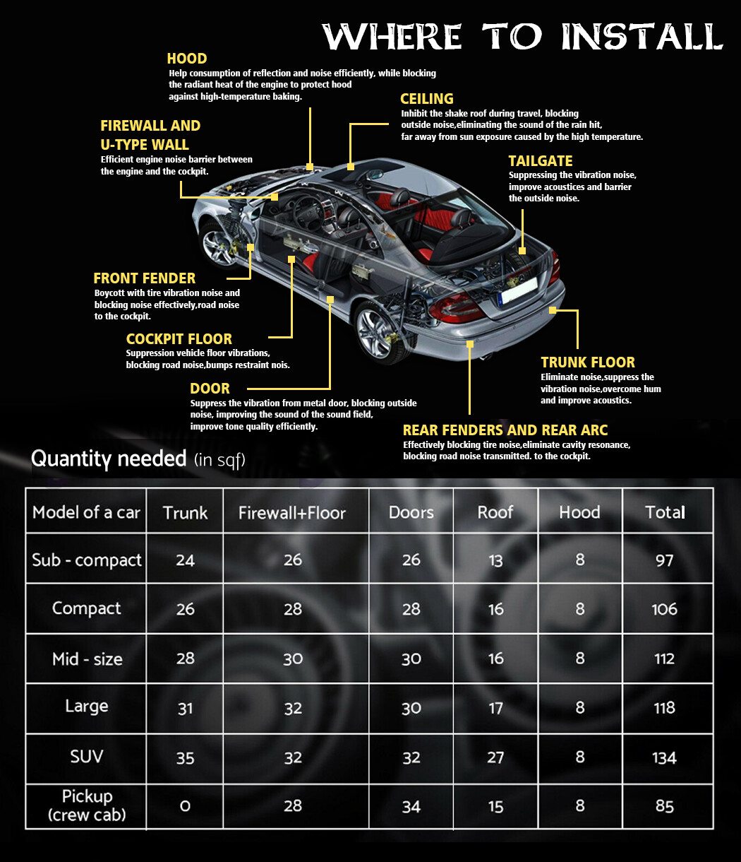 4.Can be used for the entire interior of any vehicle including: floor panel, door, carpet under/seat, headliner/roof, trunk, trunk lid, firewall (internal side).