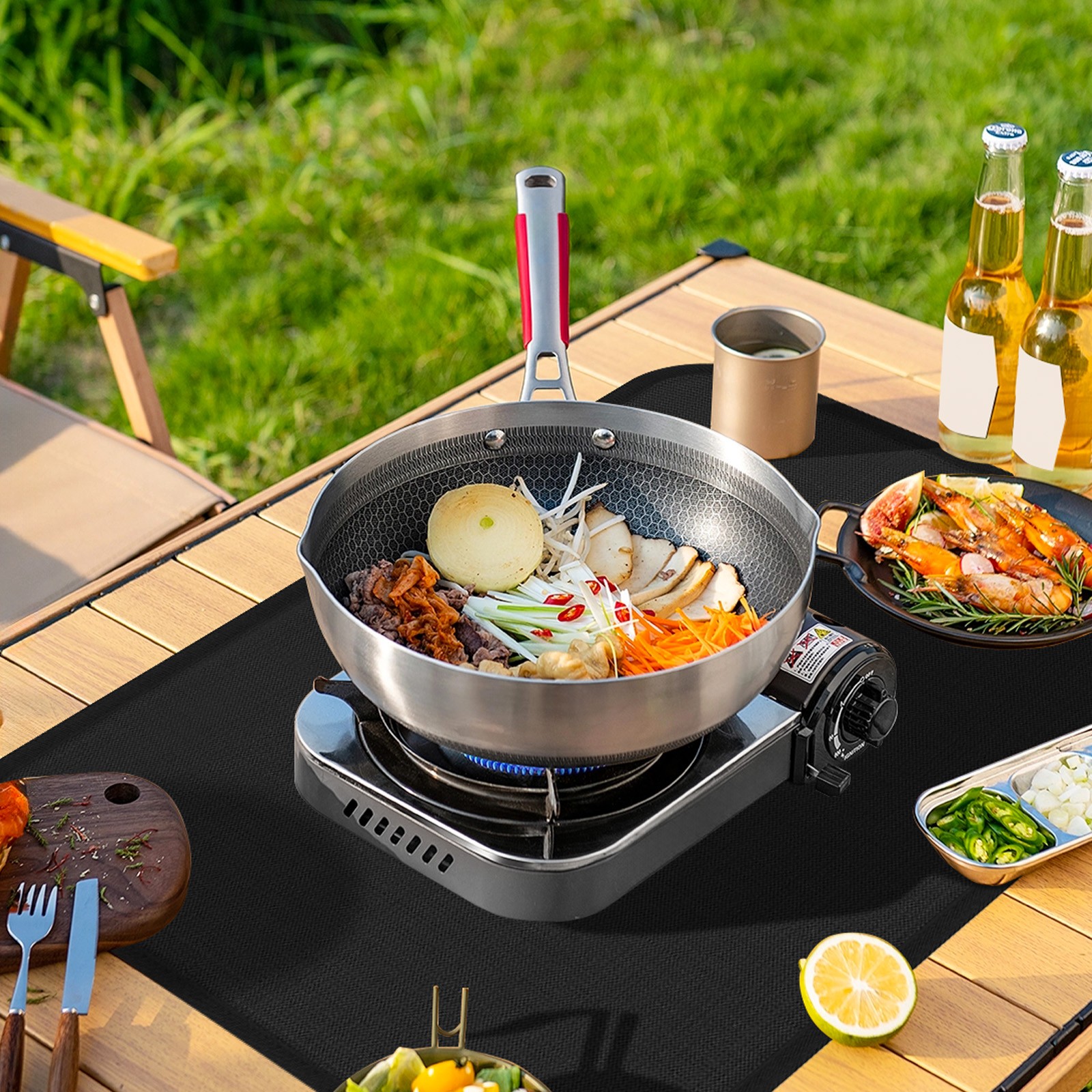 • Suitable for Many Occasions: Place heat-resistant mats under fire pits, fireplaces, small stoves, indoor searing grills, electric griddles, air fryer,toaster oven, and electric skillets so they can be securely held in place while you grill, cook, barbecue, etc.No worry about the fire pit sliding off of the table.