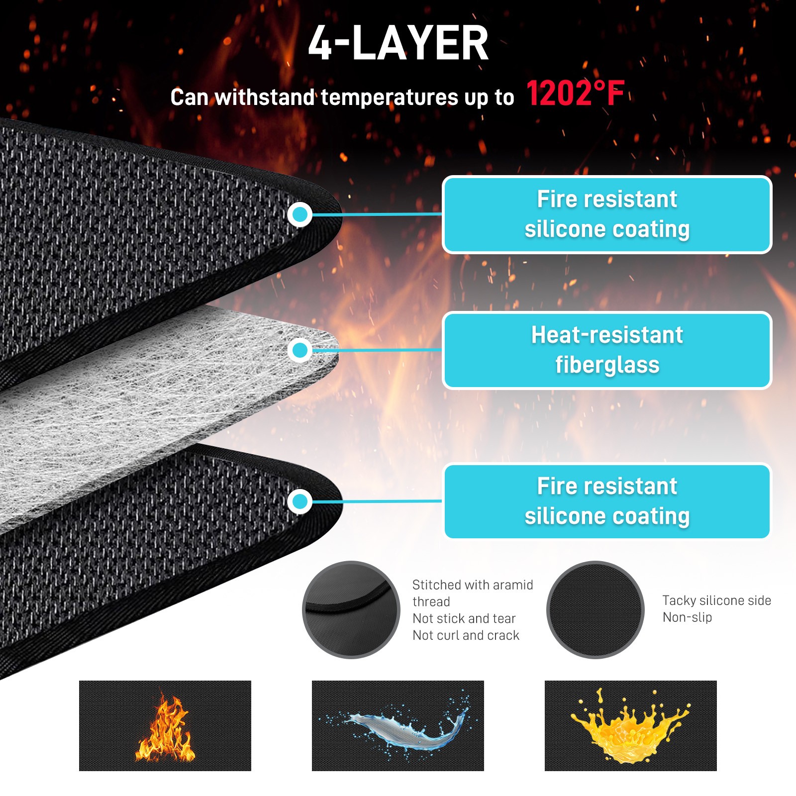 • High Temperature Resistance: redefine your grilling experience with this under grill mat for outdoor grill that presents a blend of durability and safety; Manufactured from glass fiber with a silicone coat on both sides, the grill mat can withstand the temperature up to 2000 degrees Fahrenheit; The 3 layer protective design effectively keeps the grill's heat and fire from reaching the grass or wooden decks.