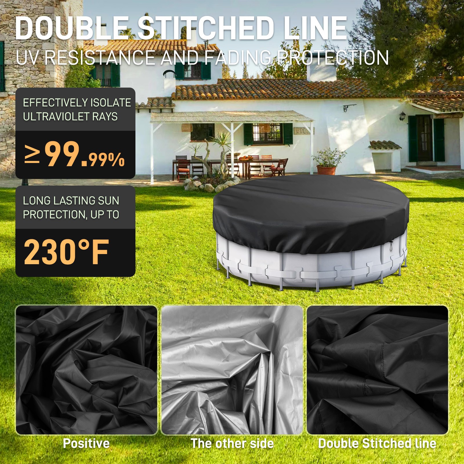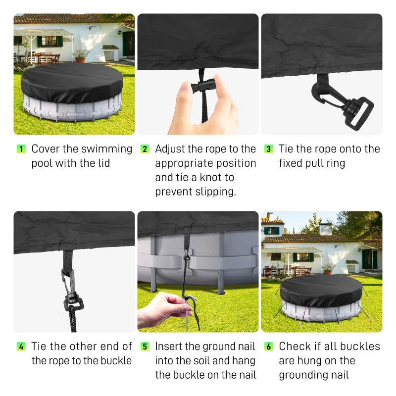 • Round pool cover is made of 420D Durable Oxford material and equipped with 8 windproof ropes and ground nails. It provides reliable protection against debris, leaves, and harsh weather elements, extending the life of your pool.No standing water goes through the cover to keep your water fresh, It's a money saver!