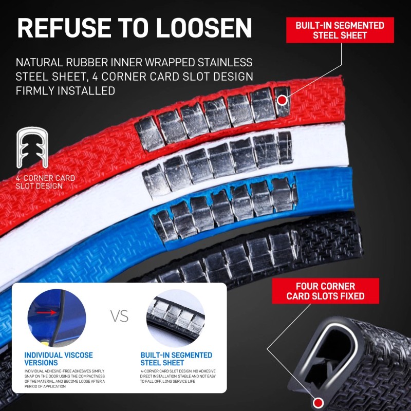 What are the advantages of our edge banding? It's a universal rubber door / boot / bonnet / edge interior exterior trim, can be used for around doors, lids, and any other exposed edge to prevent leaks, gaps, and vibration. Its flexibility makes it easy to cut and can wrap easily any door edges. U channel and snap-on design, so you needn't spend much time to install. It can also create a three-dimensional fashion look while protecting your car door. 1.GOOD QUALITY ✨Made of soft EPDM rubber with internal stainless steel clips 2.NOT EASY TO FALL OFF ✨Inside metal clips provide a firm grip on the edge 3.NO HURT PAINT ✨No messy glue, sealant or permanent fixtures (such as screws rivets) required 4.CAR PROTECTOR ✨Protect the interior and exterior from water, debris, and white-noise intrusion, also cover the existing damage, makes it look like a new car 5.EASY INSTALLATION AND REMOVE ✨Push-on installation, direct replacement without tool 6.4 SEASONS AVAILABLE ✨Scratch-proof, anti-collision, water-proof, heat and cold resistance, anti-aging