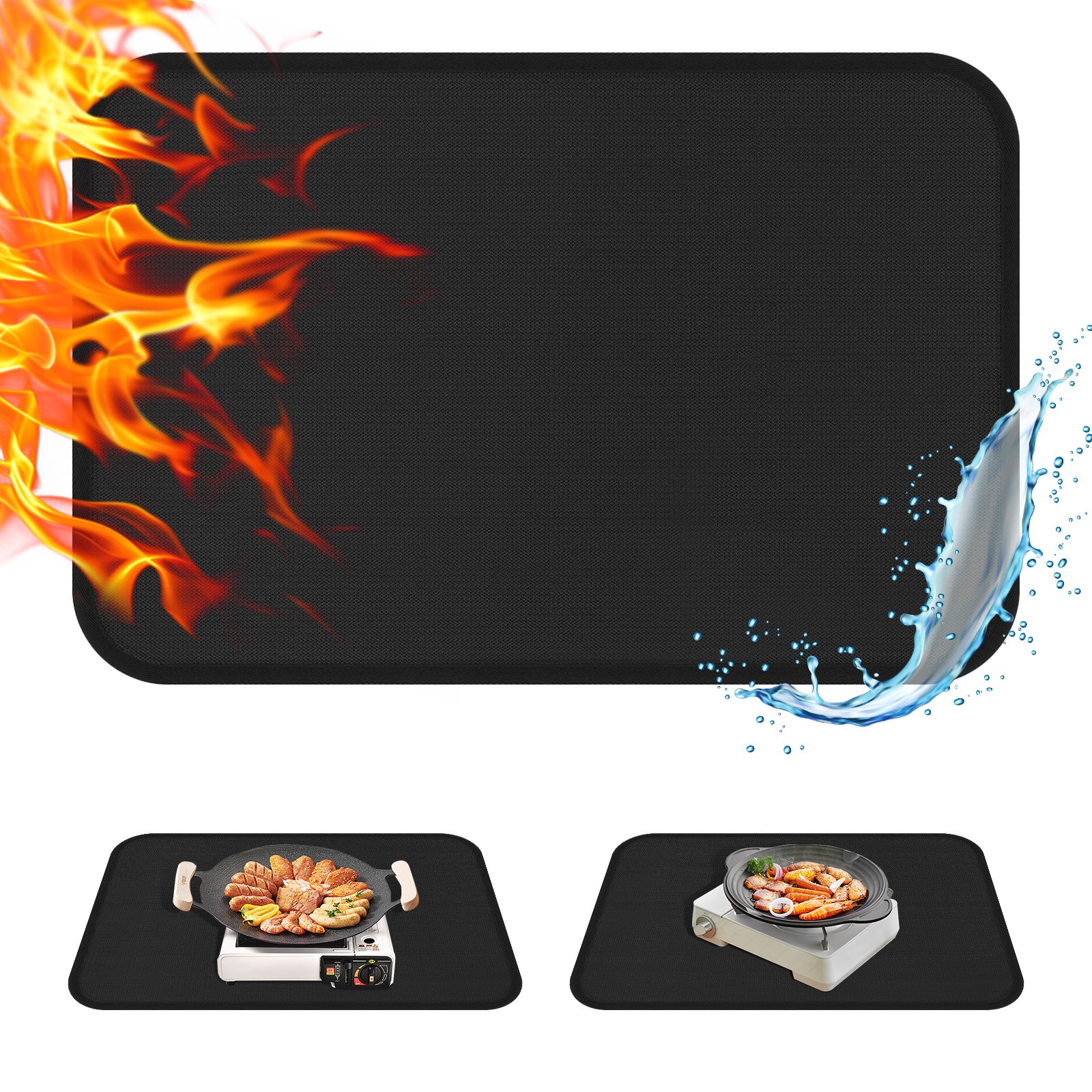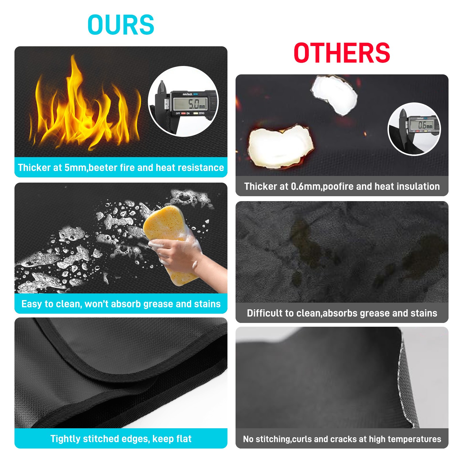 Fire Resistant and Heat Resistant: Our grilling mats for outdoor grill are made of fiberglass and can withstand temperatures up to 1202°F. Double-sided thickened silicone provides three layers of fire resistance for added safety. The edges of our heat resistant mat are finely stitched and will not stick, tear, curl or crack from the heat, would contain some liquid spills.