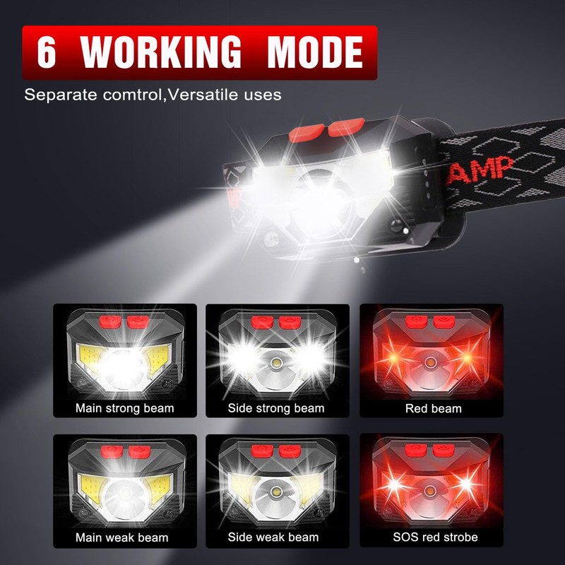 - Waterproof and 6 Modes:The headlight has IPX4 waterproof rate. The high-quality shell is more sealed and leak-proof, which is suitable for rain or snow, indoors or outdoors.Versatile lighting with 6 modes( strong light-weak light-COB white lightstrong light-COB white light weak light- COB red light strong light -COB red light flash).