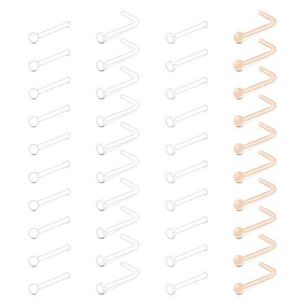 • [Item Contain]: 20pcs clear nose studs straight shape (round + flat top) + 10pcs clear nose studs L shape + 10pcs nude nose studs L shape