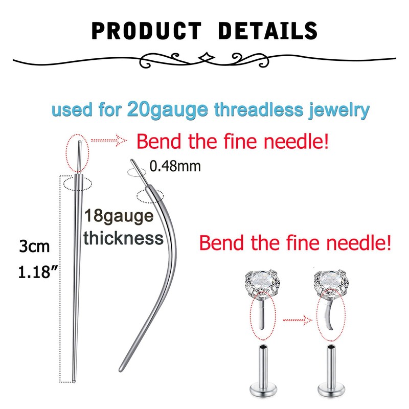 - [Measurements]: flat back nose stud 18g (1.0mm), threadless nose stud pole length: 1/4"(6mm), 5/16"(8mm); push in nose stud top size: 2.5mm, 3mm,4mm; piercing threader tool used for 18g threadless nose ring or 18g threadless cartilage earring