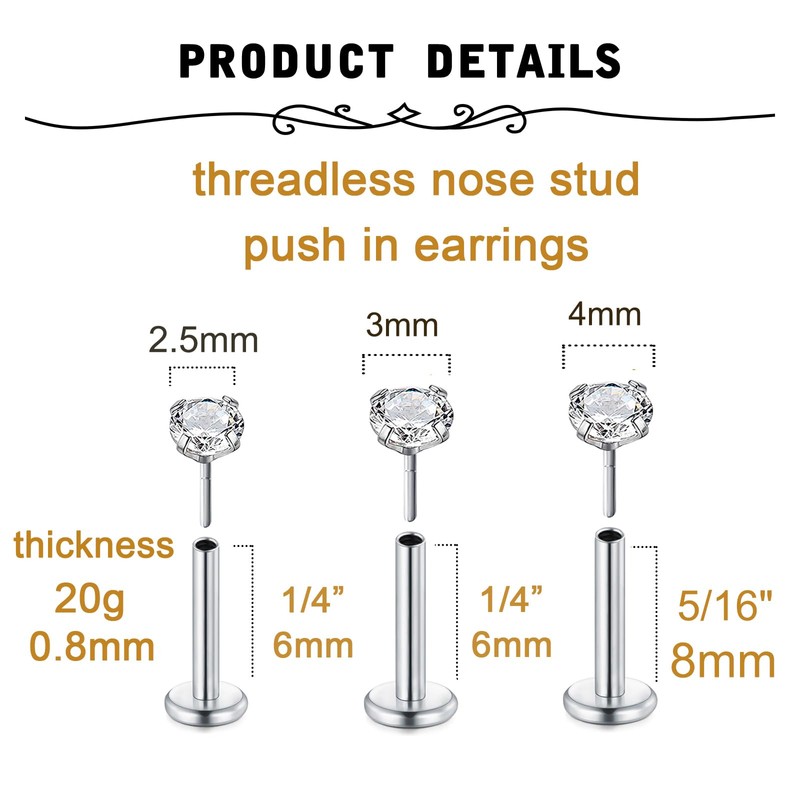 • [Measurements]: flat back nose stud 20g (0.8mm), threadless nose stud pole length: 1/4"(6mm), 5/16"(8mm); push in nose stud top size: 2.5mm, 3mm,4mm; piercing threader tool used for 20g threadless nose ring or 20g threadless earring