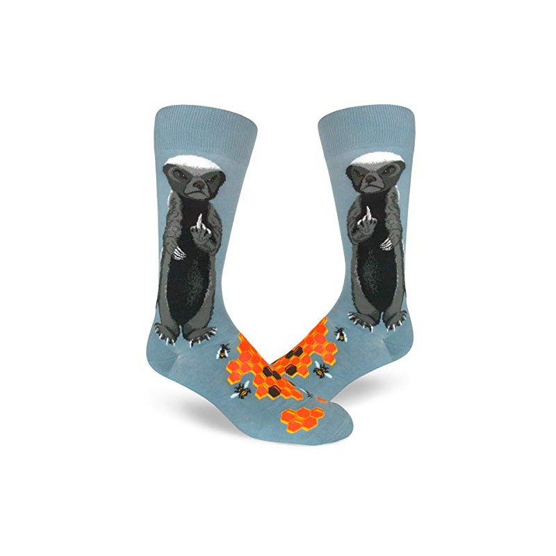 There's no badger as ornery as a honey badger. Underneath all the rage, there's even more rage. But maybe under that rage, there is a little bit of sweetness. Also, bees. These badger socks for men feature a furry varmint flipping off a bunch of honey bees. Wear a pair and tell everyone to buzz off just by lifting your pant leg!