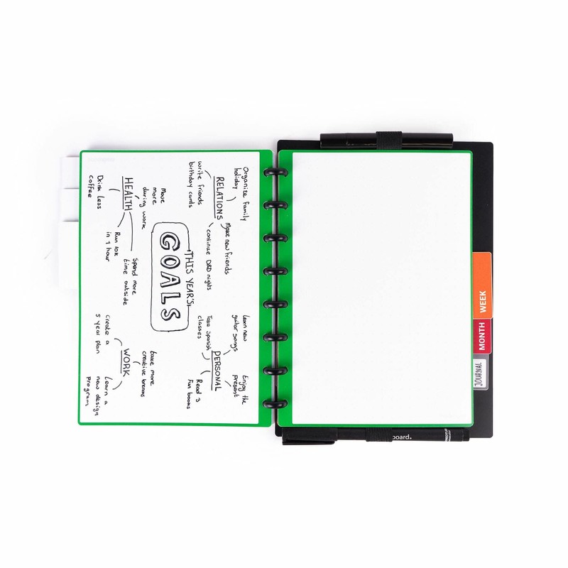 • Product dimensions and content: a pack contains 6 different tabs that match the pages of modubooq (set): to do, notes, ideas, week, month and a blank tab that you can write on yourself. Each tab measures 163mm wide and 51mm high. The back of the tabs is blank, rewritable and equipped with duratech3 technology. The blank tab can be rewritten on all white surfaces and also on the back.