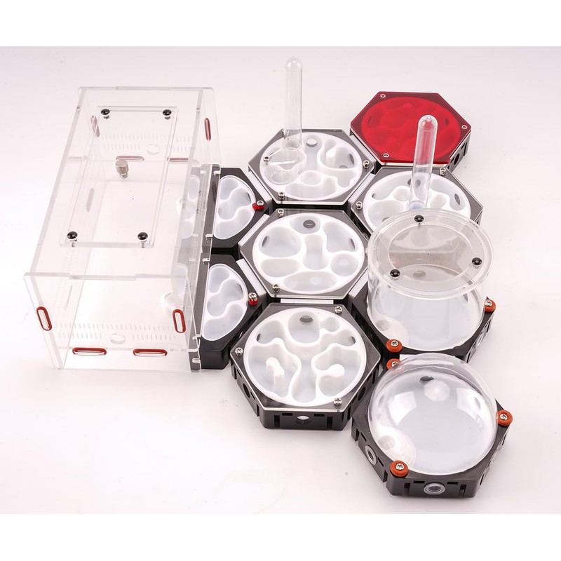 Modular Hexagonal Ant Habitat – 11-Piece Set, Interconnectable for Customizable Colony Size, with Integrated Moisture Stabilization, Red Acrylic Cover for Enhanced Observation