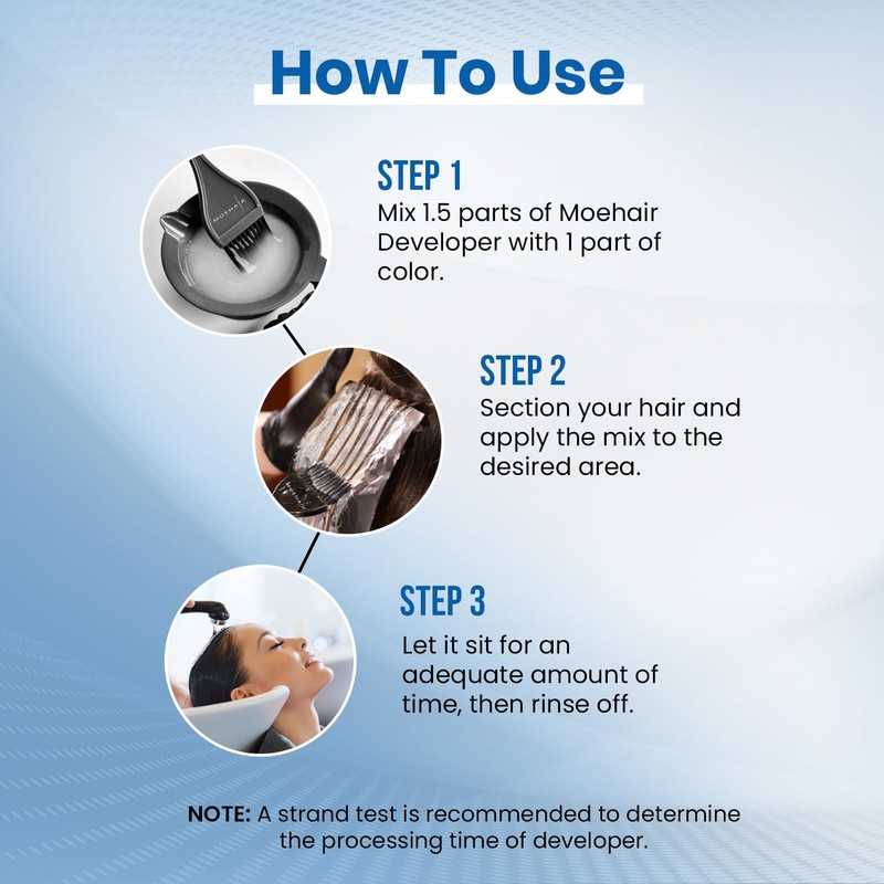 - ✔️ HOW TO USE THE 40 VOLUME DEVELOPER — Mix Moehair 40 volume developer with the permanent color of your choice in a bowl. Section hair into parts and apply the mix to the desired area. Let it process for an adequate amount of time. Rinse off with water until the hair feels clean. A strand test is recommended to be sure about the processing time and the right volume of developer. Note that the 40v developer is carefully formulated for professional use only