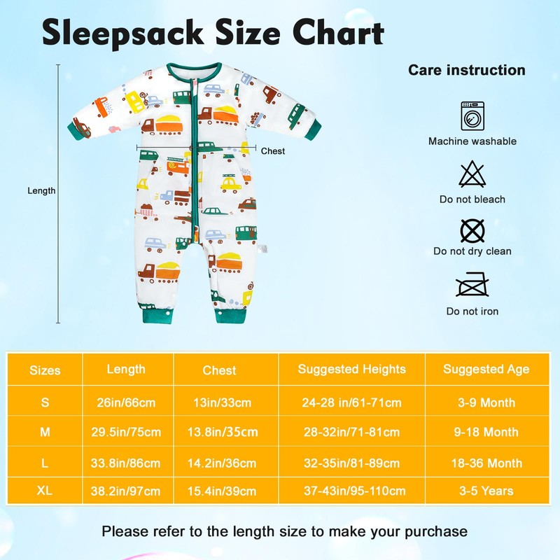 - Always stay warm: Our 2.5 tog sleeping bag with feet is suitable for room temperatures from 15 to 20 degrees. The surface and inner layer of the baby sleeping bag are made of cotton and are filled with 62.1% polyester fibres and 37.9% viscose fibres, which have been specially ironed with intelligent constant temperature technology so that they do not leak and always keep the body warm inside. And the pants and cuffs are extended to keep cold air out.