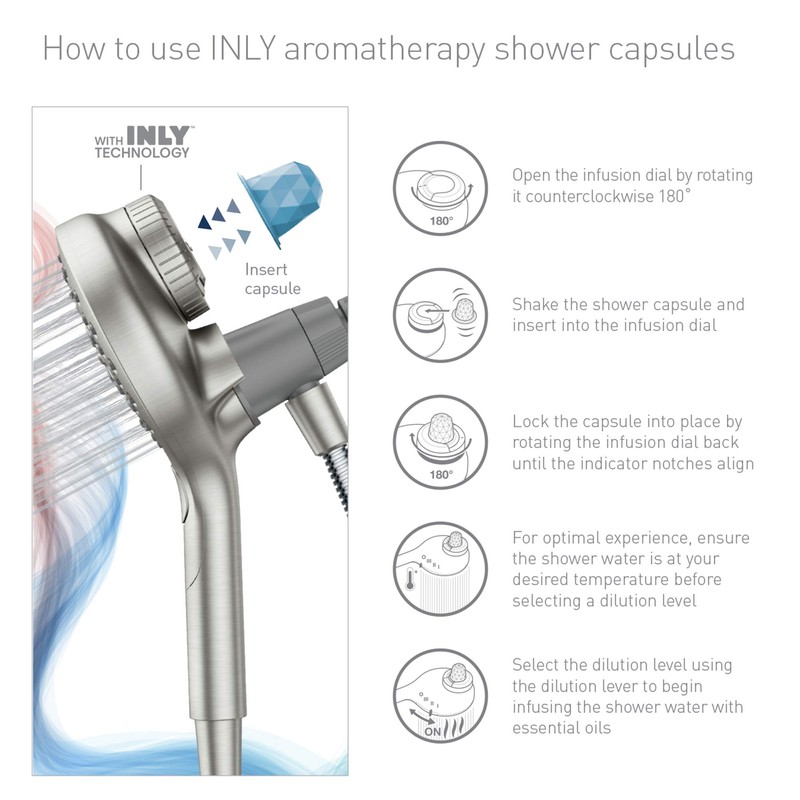 - EASY TO USE: Simply slide an INLY shower capsule into the infusion dial on the handshower. Select a preferred dilution setting to infuse the water with essential oils, creating a one-of-a-kind experience lasting anywhere from 3-10 minutes. (depending on the setting and shower environment).