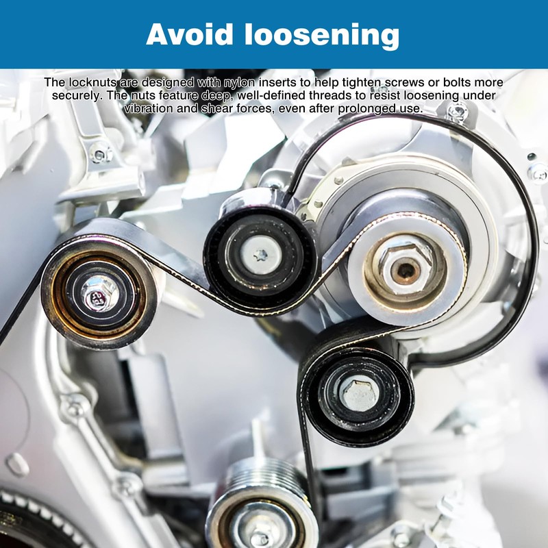 - Easy to use: the locking nut (self-locking nut) with nylon inserts ensures extremely secure locking of screws or bolts and prevents vibration. Deep cut threads minimise the risk of self-loosening - torque wrench and screwdriver are enough to tighten the locking nuts, which can be easily disassembled for use and easy installation.