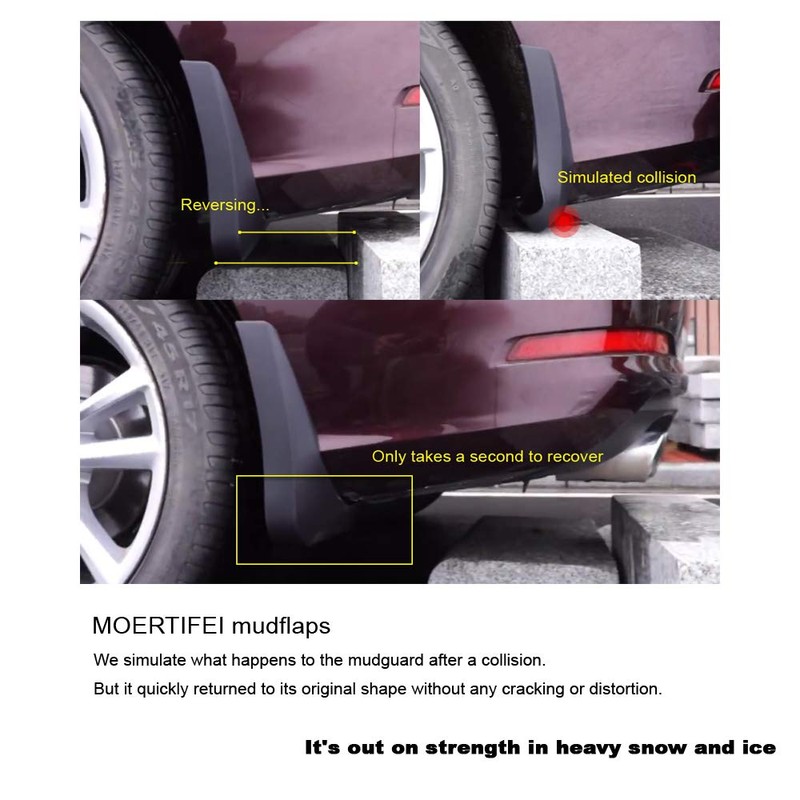 2) MOERTIFEI mudguard is manufactured using high quality ABS plastic materials, which is wear-resistant, heat-resistant, low-temperature resistant and can be stoving varnish, it can be used in the temperature range of -40 to 100°C. These mud flaps do the job and it's the right material. Not too soft yet not brittle. Please note that they are not soft plastics, they have medium hardness, because too hard plastics may break in cold winters, and too soft plastics will melt at high temperatures, but we have solved these two problems.