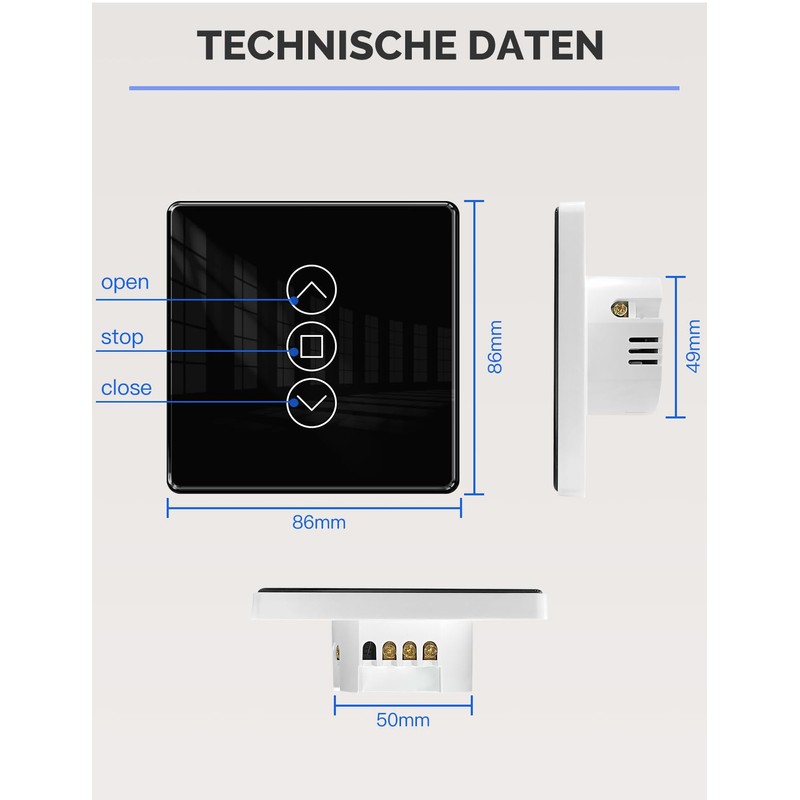 • 6. The 2.5D arc glass touch panel with gently curved, elegant shape gives your home a modern, stylish touch. The fine, rounded glass surface blends harmoniously into any interior and highlights the aesthetics of your room. Ideal for electric blinds, curtains, garage doors, awnings and projection cloths.