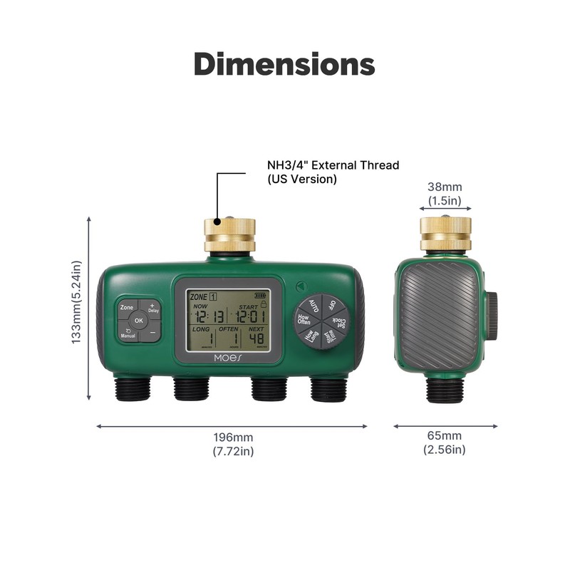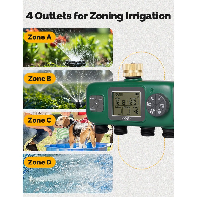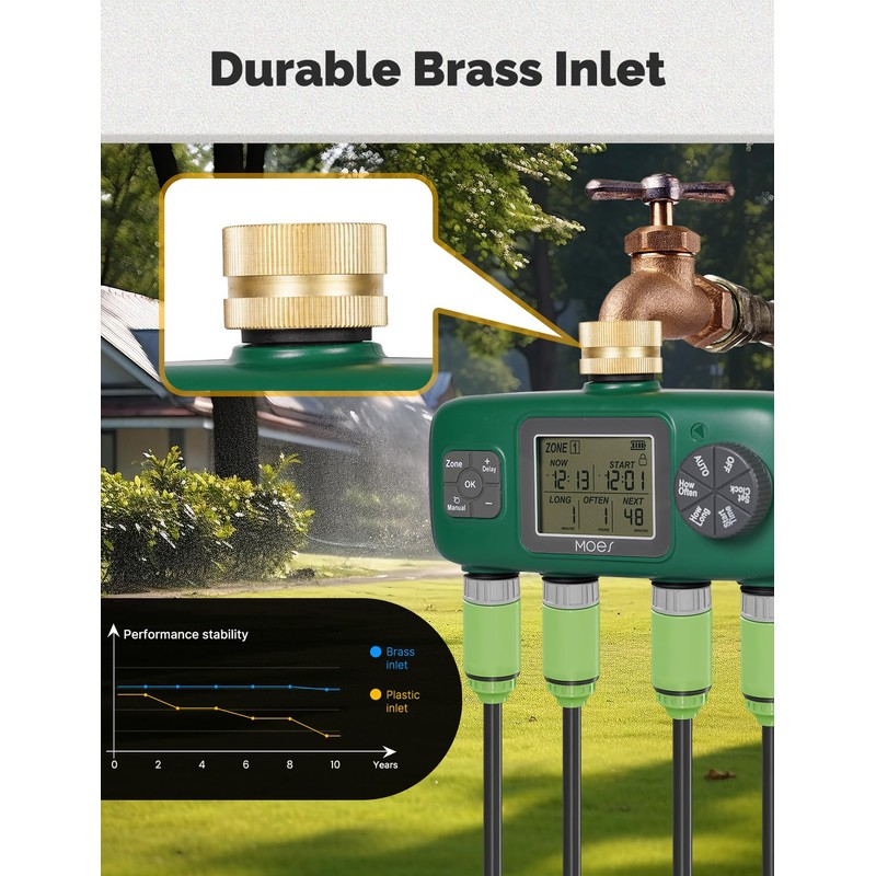 MOES 4 Outlet Sprinkler Timer, Brass Inlet, Programmable Automatic Irrigation Controller, Rain Delay, Manual Watering, 4 Zone Water Hose Timer for Gardens, Lawns, and Hose Systems