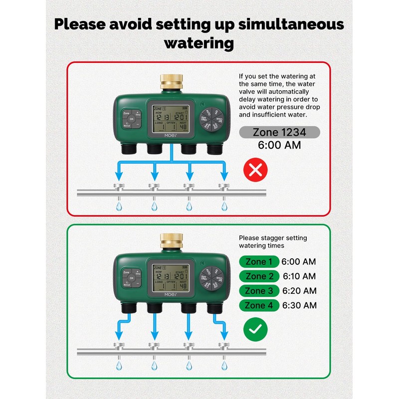 - 【Quad Independent Programmable Zones】This sprinkler timer features four separate outlets, allowing each zone to be independently programmed with customizable watering times, frequencies, and durations. It efficiently meets the irrigation needs of different plants and lawns, ensuring even watering and optimal hydration. Note: In order not to affect water pressure, please stagger the set watering times. If the set times are the same, the unit will rotate watering.