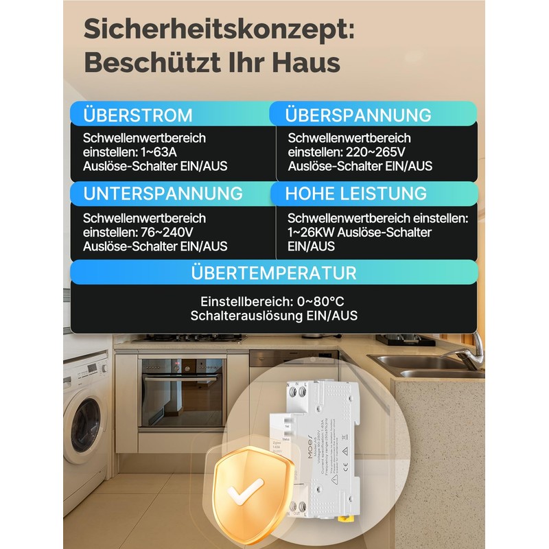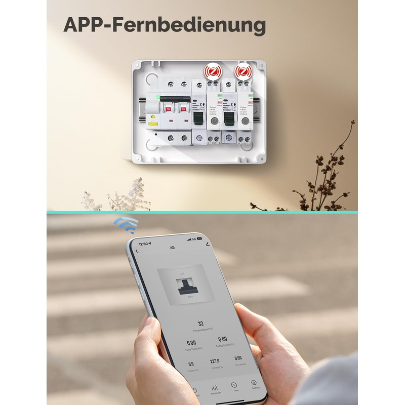 - Variable alarm threshold values: remote control and personalised alarm settings (1-63A, factory 16A preset) via app - suitable for household, commercial and industry. Breaks through fixed current limits of traditional fuses.