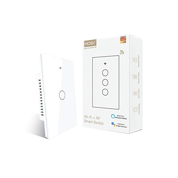 MOES Touch Wall Single Live Wire Smart Switch,No Neutral Wire Needed, 2.4GHz WiFi RF433 Light Switch Works with Smart Life/Tuya App, Alexa and Google Home, Single Pole 110V, White 1 Gang