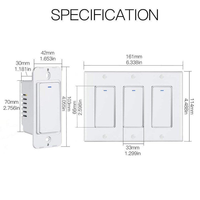 - 【Attention】Neutral wire required/ Only support 2.4GHz WiFi/ Install without power/This switch is considered a conventional Single Pole switch when installed.