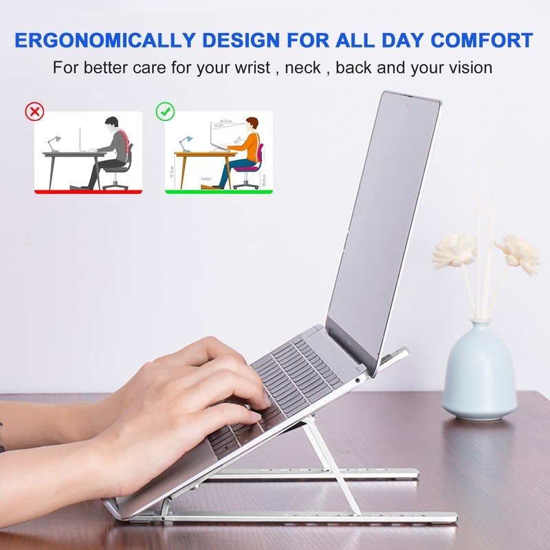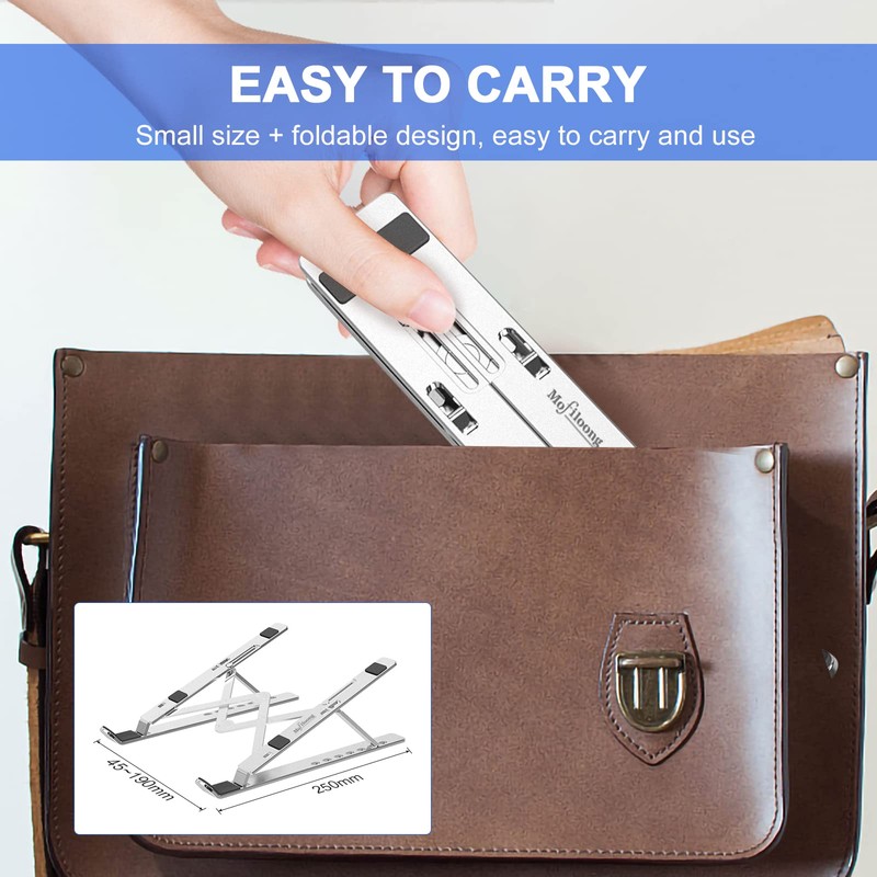 - [Light and portable] This laptop stand is made of aluminum alloy and weighs only 0.6 pounds. It is only 1.7x10 inches after folding and can be easily put into the backpack. This laptop stand is very portable and suitable for travel.