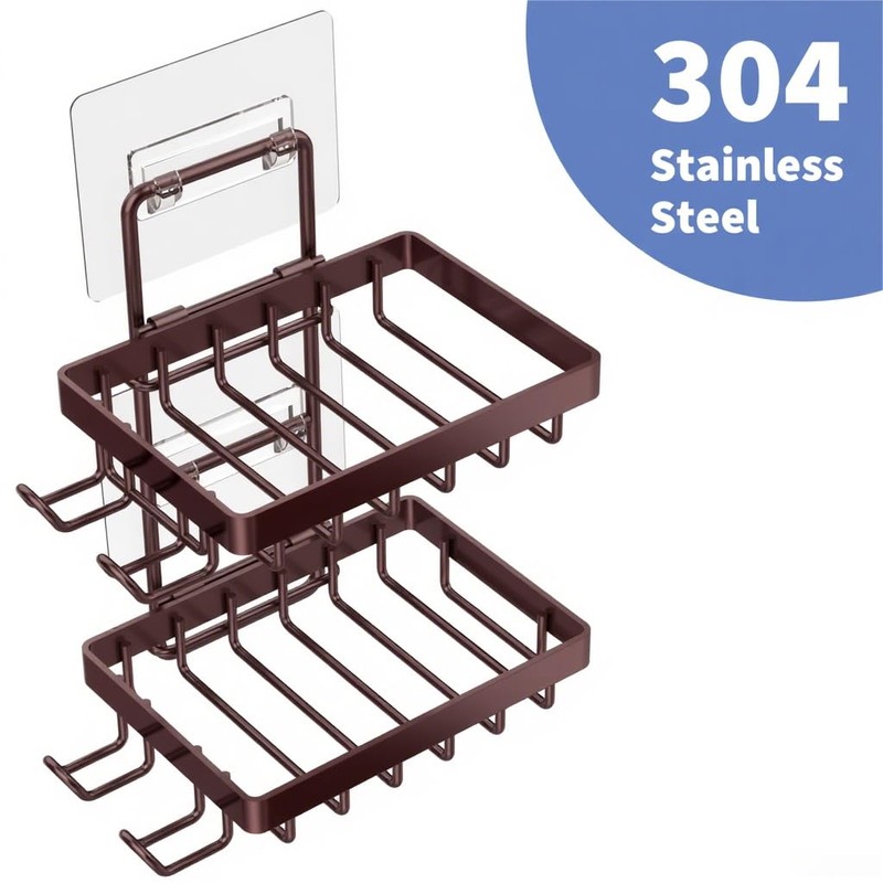 Moforoco Brown Double Soap Bar Holder for Shower, No Drilling, 304 Stainless Steel, Wall Mounted Soap Holder with 4 Hooks and Razor Holder, Shower Rack Soap Tray Bar Soap for Bathroom Accessories