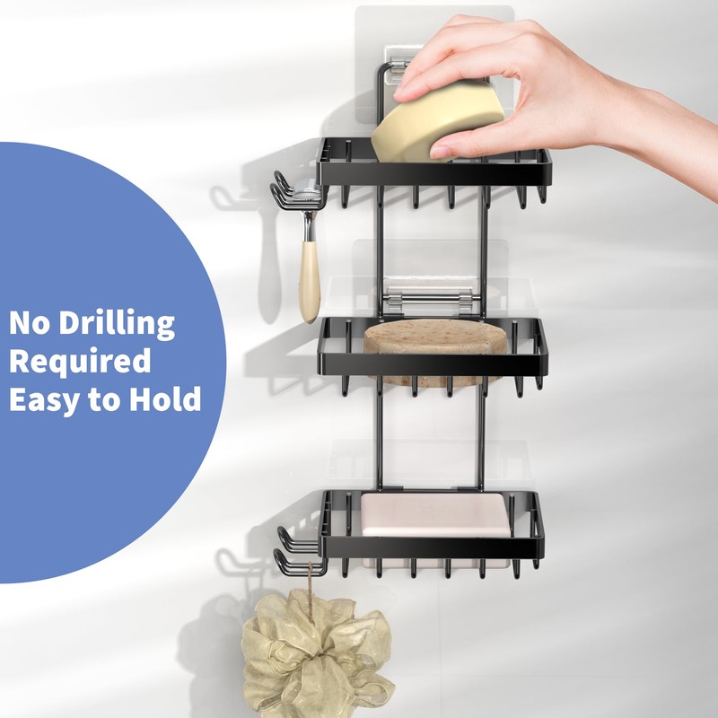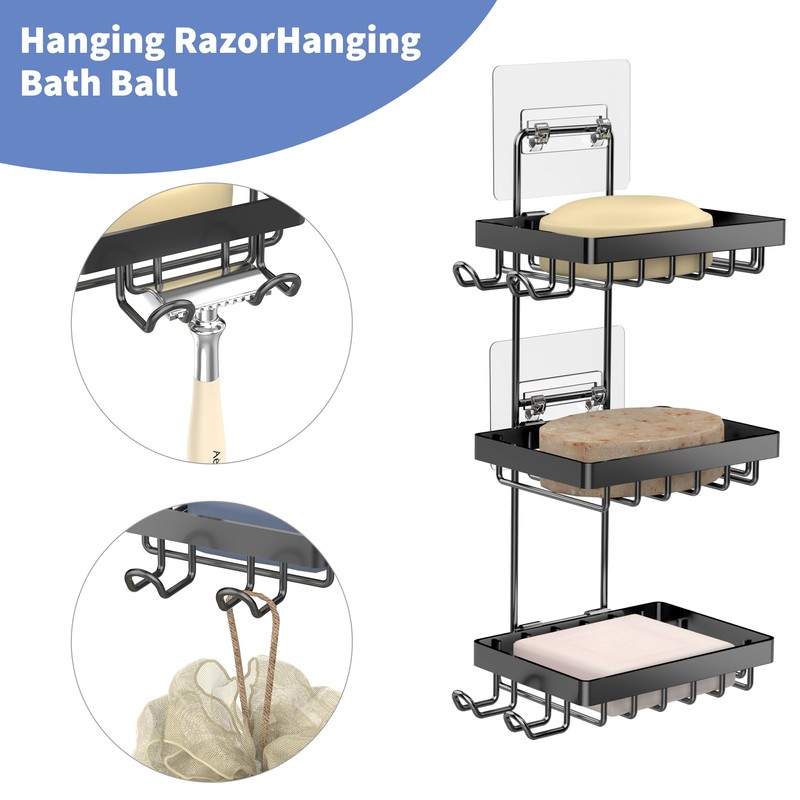 Moforoco Soap Dish Holder for Shower Wall, No Drilling, 3-tier 304 Rustproof Stainless Steel, Soap Bar Holder with 4 Hooks and Razor Holder for Shower, Shampoo Bar Holder for Shower Caddy for Bathroom