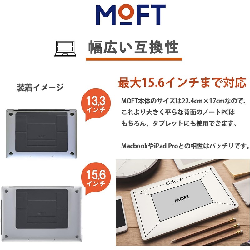 - (Incredibly thin, unforgettable) Weighs only 3.0 oz (89 g), and thickness is 0.1 inches (3 mm). The built-in magnet design allows the stand to be hidden under a computer when storing it, and makes it extremely thin in presence. On the other hand, it makes it fast and smart when you stand up, and once you use it, it is hard to forget it. It can support up to 15.6 inches and has a bottom hole for heat dissipation. Compatible with MacBook Pro/Air/Tablets, and other flat-bottom laptops, so please try the MOFT Stand once!