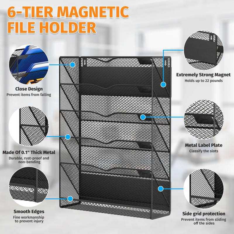 - 【Durable Magnetic Material】The wall mount file holder is made of high-quality metal, sturdy and durable, not easy to deformation, not easy to rust, can be used for a long time. The 6 tier magnetic file folder holder is engineered for durability. Our hanging holder guarantees a slip-free experience, keeping your essentials securely in place.