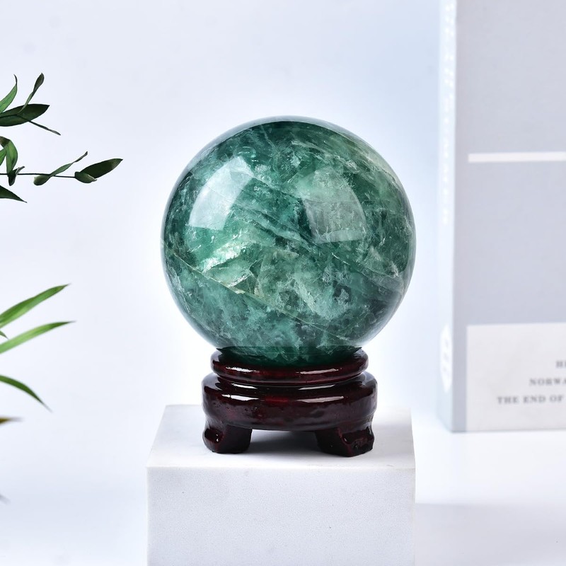 MOGEMT Green Fluorite Crystal Ball with Stand Large Crystals Sphere Decorative Ball Meditation Witchcraft Home Decor 90-100mm/3.5-3.9"