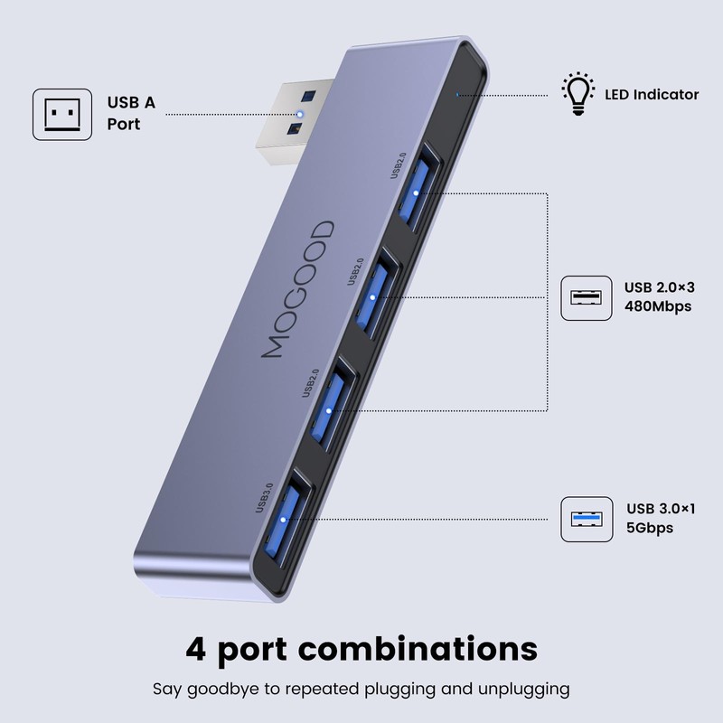 - 【USB Extension】USB hub transfers a single USB port into 4 USB data ports. Solve the problem of fewer ports in laptops, solve the problem of sharing data between hard drives and say goodbye to repeated plugging.