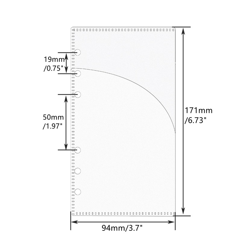 Dimension: A6 frosted binder pocket size is 94mm x 171mm (3.7" x 6.73''), the hole spacing is 19mm and 50mm, the internal pocket can hold 3.58" x 6.38" or smaller files, as picture show