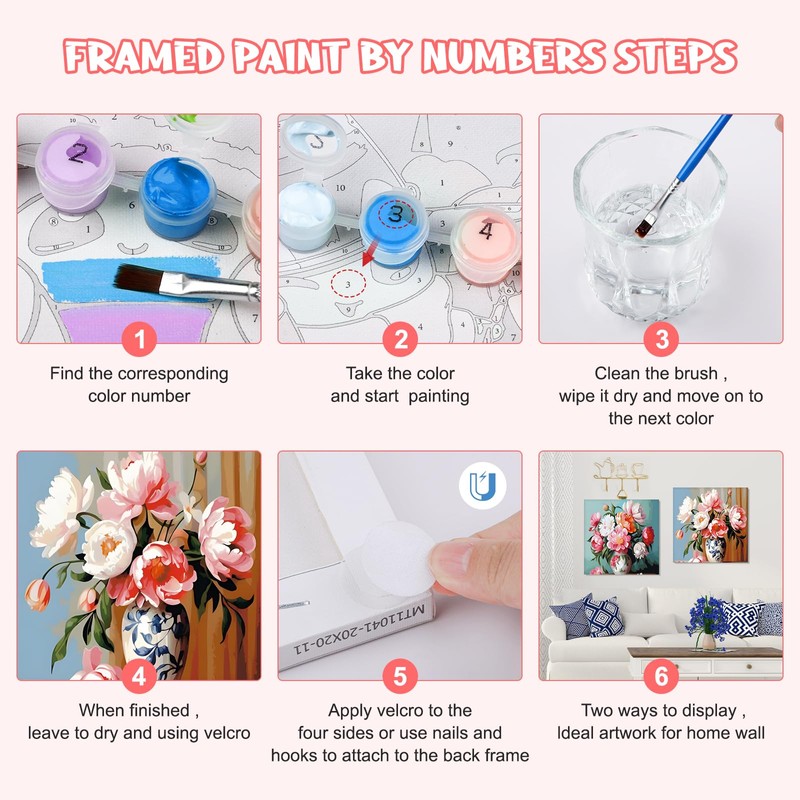 1. Find the corresponding number of paint on pre-printed canvas and paint the number areas accordingly.