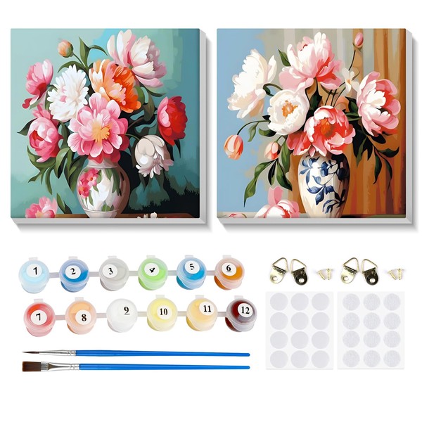 MOGTAA Framed Paint by Number for Adults Kids 2 Pack, Flowers in Vase Paint by Numbers for Beginners, Acrylic Paint by Number Kits On Canvas, DIY Oil Painting by Number Kits for Home Decor (8x8inch)