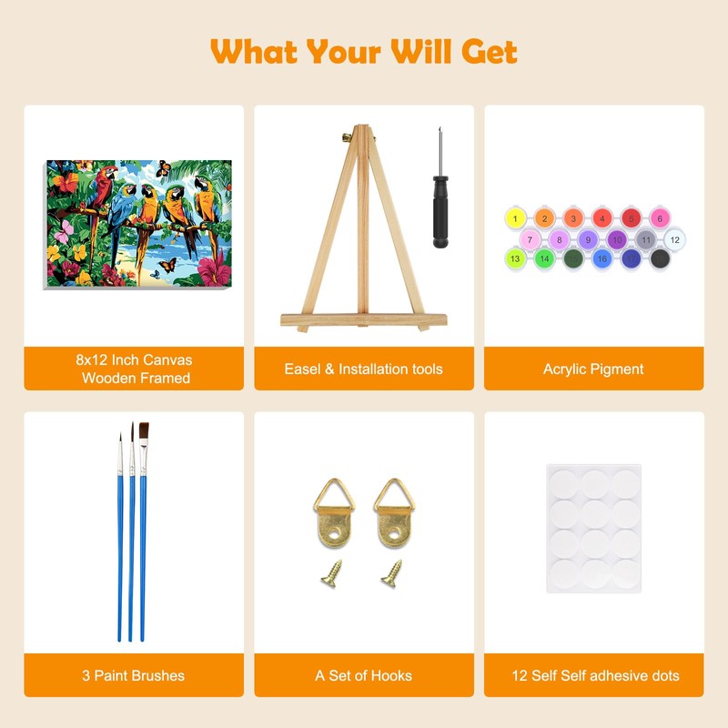 - What you get: each painting by number kit contains a pre-printed canvas (with frame), a wooden easel, three brushes in different sizes, a set of colourful acrylic pigments, a set of nail hooks, a reference picture and eight self-adhesive dots