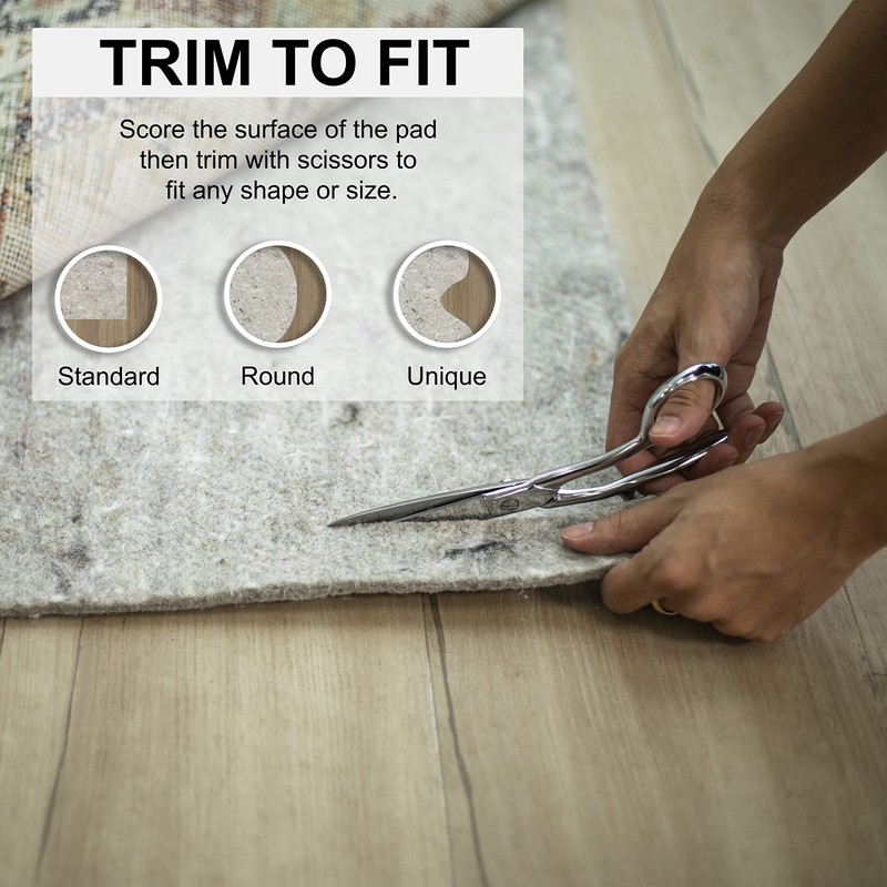 - CUSTOMIZABLE SIZING: Simply score the surface and trim your rug pad with scissors to fit any area rug size or shape by cutting approximately 1-2 inch short of your area rugs perimeter.