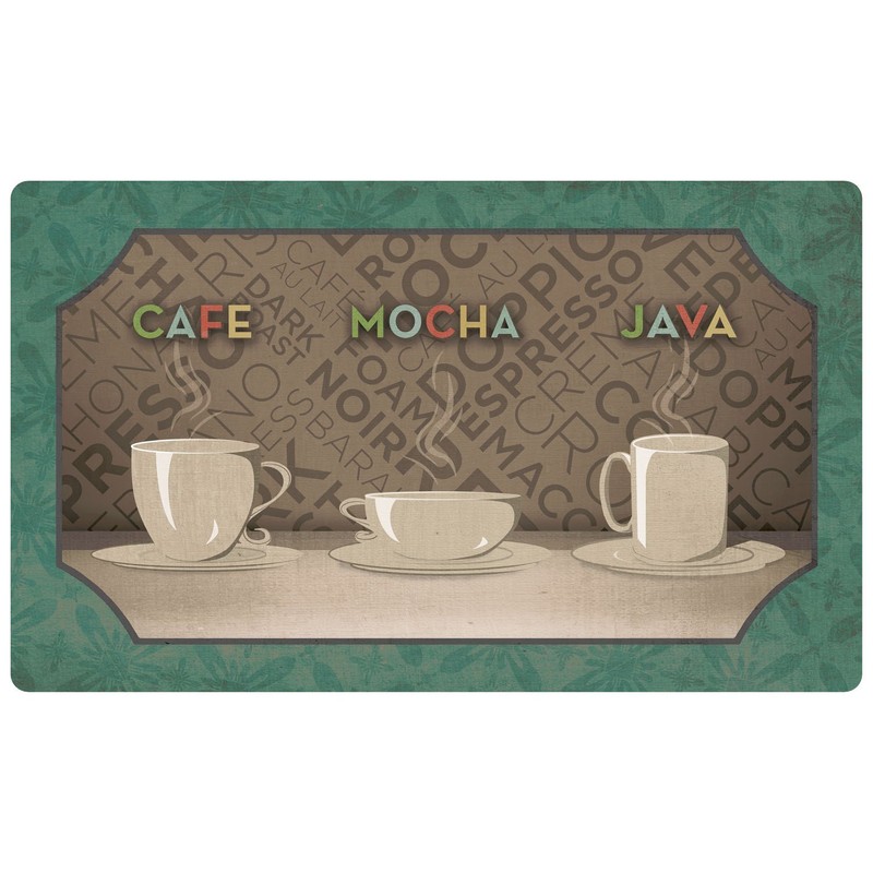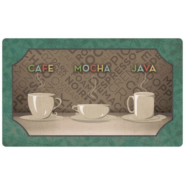 Perfect to perk up any decor, the coffee selection comfort mat features vocabulary synonymous with your favorite flavors! printed with our exclusive heat transfer technology on to 100Percent premium polyester, this kitchen mat offers a comfortable cushion underfoot protecting you from the hard floor beneath. Additionally, polyester is stain resistant so clean up is a breeze! simply spot clean spills with a solution of mild detergent and water