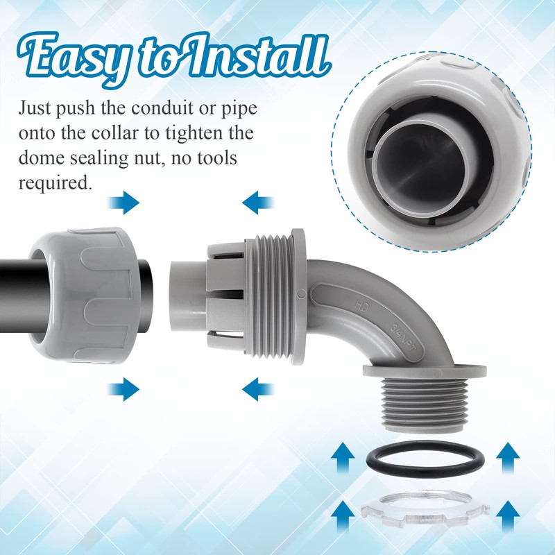 • Easy to Install: Pvc conduit fitting is quick to install, no need to disassemble, just push the conduit or pipe onto the collar to tighten the dome sealing nut, no tools required, reusable.