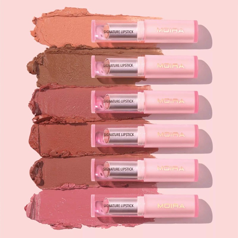 Moira Signature Lipstick es una fórmula ligera que combina la textura de un bálsamo cremoso y el brillo de un gloss en un solo producto. Está enriquecido con mantequilla de semilla de mango y escualano, ingredientes que proporcionan una aplicación cómoda y se funden instantáneamente en los labios, sin dejar sensación pegajosa.