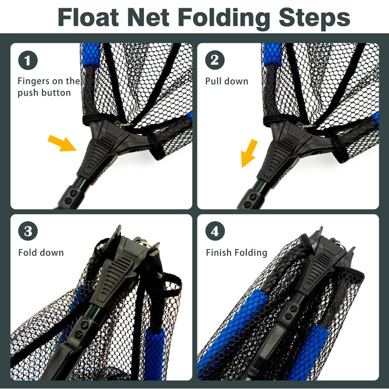 Easy to fold up and carry: Pull down the clip between the landing net head and the handle, easy to fold up the head net and rotate the button on the handle to close, then you got a 17.7'' fishing net to carry by belt clip or storage in your fishing bag.