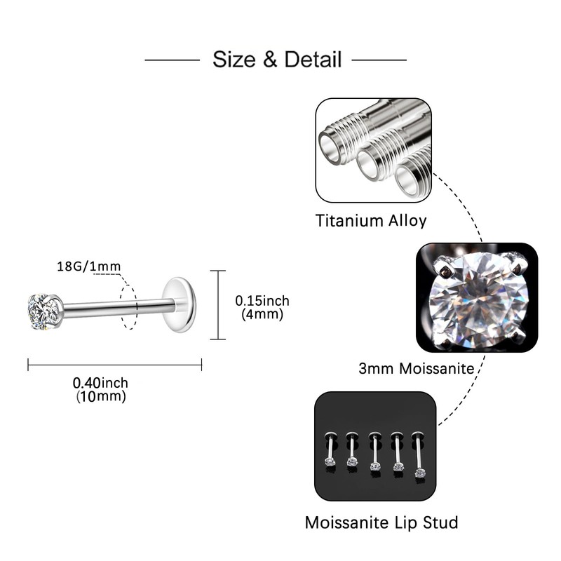 - Perfect Size: Lip Ring Gauge: 16G=1.2mm/18G=1mm; Bar Length: 8mm/10mm/12mm; Moissanite Size: 3mm/0.1ct. Perfectly fitting various lip shapes.