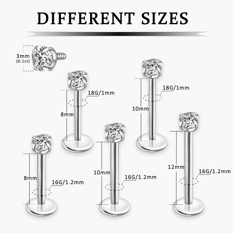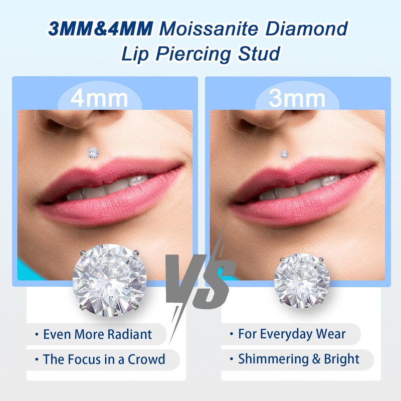- Perfect Size: Lip Ring Gauge: 16G=1.2mm/18G=1mm; Bar Length: 8mm/10mm/12mm; Moissanite Size: 3mm/0.1ct. Perfectly fitting various lip shapes.