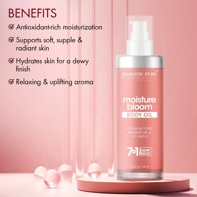 - Intense Hydration: The rich blend of Cocoa Butter and Vitamin E in Moisture Bloom Body Oil and women deeply hydrates skin to lock in moisture, creating soft, supple skin with a smooth and velvety feel.