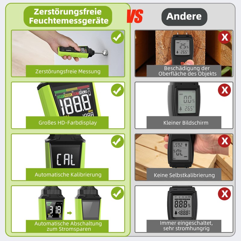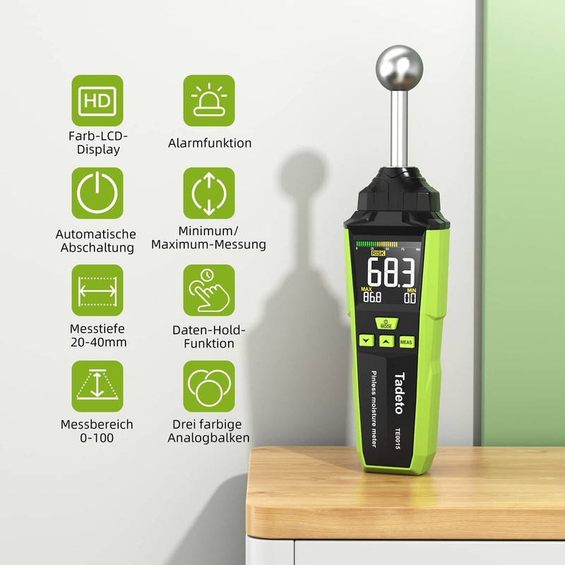- Improved HD colour screen: the backlit LCD colour display of the moisture meter has been equipped with a consistently higher brightness, regardless of the light intensity, the measurements can be read in a range of 360° without blind spots. Featuring a 3-color bar chart, "DRY", "RISK" and "WET" status in "Green", "Yellow" and "Red". With hold function, max/min display, optical and acoustic alarms (alarm range can be set manually).
