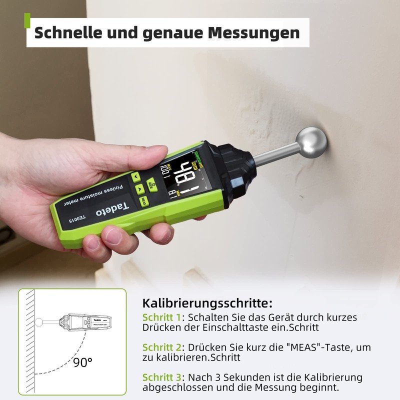 - Automatic calibration: the wall moisture meter can be automatically calibrated and only takes 3 seconds to start measuring after switching on and pressing "MEAS". Recalibration is required every time you change the measurement environment. Hold the bottom of the wall moisture meter firmly to prevent moisture on your hands from affecting the results. Please note: metal cannot be measured.